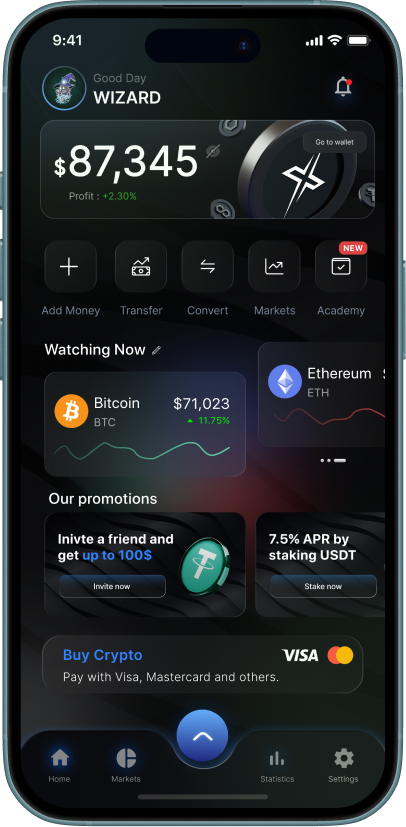 Fund your account via card, bank transfer or crypto deposits.